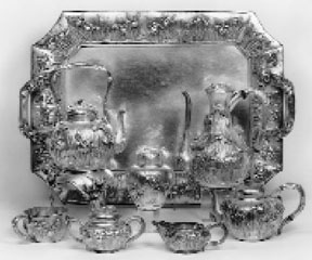 Comprising: teapot, coffee pot, covered sugar, footed creamer, cartouche-form tray with pierced foliate
