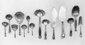 Seven tablespoons, three salt spoons, five tablespoons, ice tongs. Monogrammed.