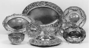 Five-Piece Chinese Repousse Silver Dresser Set.