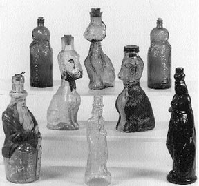 Colorless Pittsburgh carafe, two blown glass candle holders, a Pairpoint paperweight, an amber glass footed salt.