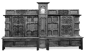 Comprising: two hinged-top chests and two carved chamber sections with sliding doors, and a tall case clock with enamel dial, Roman Numeral chapter ring and pierced repousse surround, spandrels depicting dancing peasants.