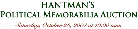 | Held on Saturday, October 23, at the Elks Club, in Rockville, Maryland, and featured John F. Kennedy and Jacqueline Kennedy memorabilia, Senator Daniel Patrick Moynihan political memorabilia (part 2), Ronald Reagan, George H. W. Bush and other Presidential political memorabilia. Highlights included the rocking chair that JFK gave to Cardinal Cushing, classic Jacqueline Kennedy’s clothing, Jacqueline’s funeral stationery, White House stamped photographs, and correspondence. Illustrated Highlights View our text-only catalog in PDF format Auction Date: Saturday, October 23, 2004 Location: Washington Rockville Elks Lodge