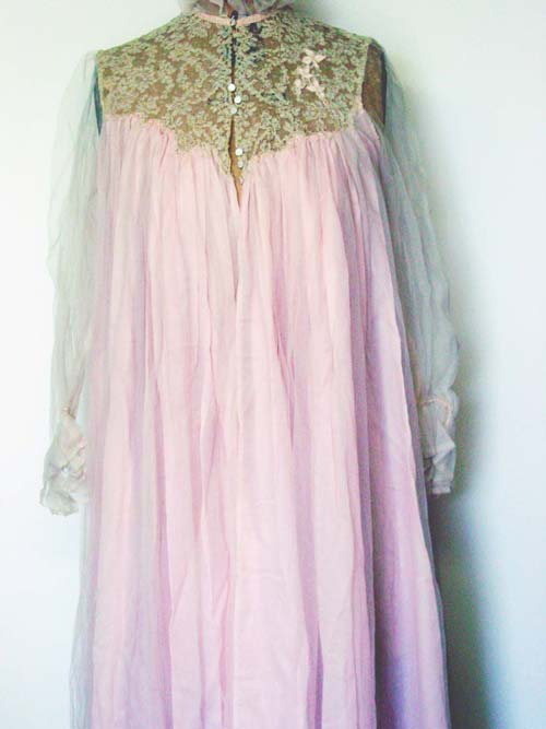 Pale pink ecru nylon net and lace, with a 7 ecru lace standup collar embroidered with pink flowers upper left, sheer net ruffle at neck and at cuffs, the front-closing bodice with three sets of three small buttons, long sleeves, body with sheer netting over pale pink nylon, apx. 58l, labeled: Dijon, New York, hole to right sleeve, netting fragile on right sleeve, small hole in right front, small black smudge on front left.
