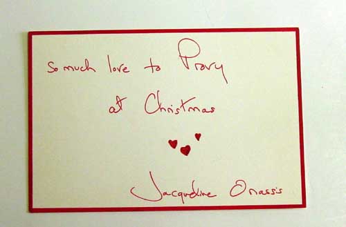 Personal Christmas greeting inscribed: So much love to Provy at Christmas, Jacqueline Onassis with three drawn hearts, red ink on a white card with red border, no envelope or date, 5 x 3 1/2.