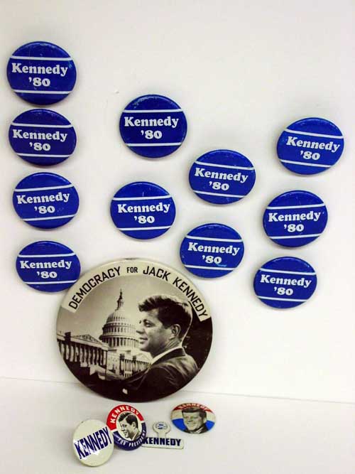 Buttons for John F. Kennedys 1960 campaign include: one Democracy for Jack Kennedy with JFK photo, 3 1/2 dia.; one Kennedy on red, white and blue stripe with JFKs face, 1 dia.; one Kennedy for President, and pair Kennedy round pins made into screw-back earrings together with ten Kennedy 80 pins used for Edward Kennedys campaign, 1 1/4 dia.