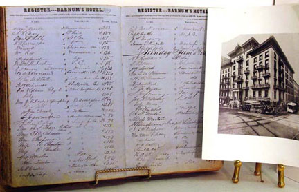 | Lot 144 Baltimore Barnums Hotel Guest Register. April 9, 1859-September 20, 1859. Incredible collection of autographs from Baltimores premiere hotel in the 1800s. Barnums Hotel, located at Calvert and Fayette Streets, was founded by David Barnum (not P.T., the circus owner) and spread Baltimores fame for good living throughout the civilized world. The most comfortable of all hotels in the United States, wrote Charles Dickens, a guest in 1842. It was at Barnums, no doubt, that he shared with Washington Irving that enchanted julep which held out far into the night. Here were entertained Presidents John Quincy Adams, Andrew Jackson and Martin Van Buren. Daniel Webster spoke from the steps, from a balcony Jenny Lind, the Swedish Nightingale, waved to an adoring crowd before her concert in December 1850, for which seats were auction at $100 apiece. This noble institution closed its doors in 1889 and was razed to make way for the Equitable Building. This ledger contains signatures of hundreds of soldiers who later fought for both the Union and Confederate armies. There are over 60 signatures alone of officers in the Union army in 1859 that were Generals in the Civil War, half of whom fought for the South. Many signatures are rare, including Belle Boyd, James Buchanan (pg 84), Eli Whitney (pg 138), Cyrus McCormick (pg 289), Robert Rhett (pg 325), Charles Lewis Tiffany (pg 349), Stephen Douglas (pg 395 and 442), Samuel Morse (pg 44), Burton Harrison (aide to Jefferson Davis). One month after this ledger ends John Brown raided the U.S. Arsenal at Harpers Ferry, Virginia. This ledger contains the signature of five individuals who played important roles in that very historic incident: (1) Alfred M. Barbour (twice), Superintendent of Armory at Harpers Ferry and noted SCA Spymaster who tried to seize the Arsenal for CSA; (2) L.W. Washington, hostage of John Browns in the engine house; (3) Fontaine Beckham, Mayor of Harpers Ferry, one of three civilians killed in John Brown raid; (4) Andrew Hunter, Prosecutor for State of Virginia at John Brown trial; (5) Lawson Botts, first defense attorney of John Brown. This collection also has various framed ephemeral items from Barnums Hotel during the 1800s; 15 3/4" x 10", spine broken, corners bumped, tears, stains, page edges foxed, cover released from spine, Together With a black and white photo of the Barnums Hotel, 14" x 11", unframed. |