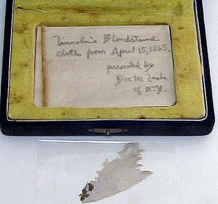 | Lot 316 Abraham Lincoln Purported Bloodstained Towel Fragment. Piece of the towel used by the first doctor to attend Lincoln after he was shot by John Wilkes Booth in the Presidential Box at Fords Theatre, Apx. 2 1/4" x 1", housed in a velvet hinged case. Together With an autograph note in an unknown hand, Lincolns blood stained cloth from April 16, 1865 presented by Doctor Leale of New York. |