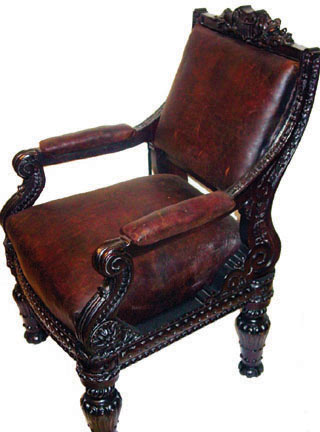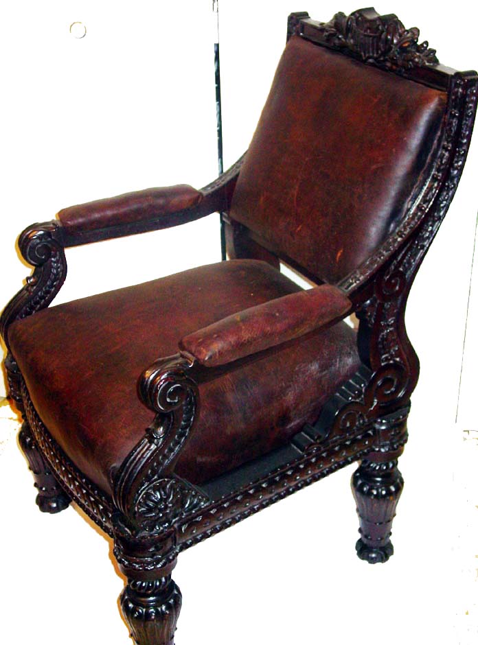 | Lot 423 Victorian Renaissance Revival Carved and Stained Oak Congressional U.S. House of Representatives Armchair. Circa 1857. Stenciled A. Bembe Kimble, 20 Broadway, New York on rear interior seat rail, H: 38 1/2" Rectangular backrest centering a shield, five-pointed stars and laurel leaf crest, foliate-carved stiles, scrolled terminals, guilloche-carved seat rail, raised on foliate-carved legs, brown leather upholstery. PROV. Lawrence Rosenbert, Confederate, Musician, 25 Battn Virginia Infantry. These U.S. House of Representative armchairs were designed by Thomas U. Walter, Architect of the U.S. Capitol, and made by A. Bembe, A. Kimbel, 928 Broadway, New York, for use in the House of Representatives chambers. Two hundred sixty-two of these chairs were supplied for use in the House Chamber from 1857-1873 and were subsequently replaced by less bulky mahogany chairs. In 1857 House members totaled 241. When representatives of the eleven states that formed the Confederacy withdrew, the number of House members reduced to 175. The excess chairs were distributed to other government buildings and fourteen were removed from the House of Representatives and released to the public. Lincoln in the White House used one and Matthew Brady obtained another for use in his photography studio. Known to be Lincolns favorite posing chair, this chair appears in many portrait photographs taken by Matthew Brady. Bradys best-known photograph of Lincoln is the portrait of President Lincoln and his son, Tad, which was taken four days before his assassination and was copied as a small folio print. Alexander Gardiner, an associate of Brady, and later owner of his own photography studio also obtained a chair. Similar chairs are owned by the Smithsonian Institution, two in the Lincoln Room of Lincoln Memorial University at Horgate, Tennessee, the Chicago Historical Society and Alexander Gardiners studio is currently owned by the Ft. Wayne, Indiana Historical Society. This chair is accompanied by a provenance letter. |