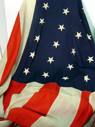 | Lot 432 American Civil War Era Flag, Thirty-Four Star. Hand-stitched and reinforced linen, with starts both hand and machine stitched, rope through hoist, numbers and Crowell [65th NY Infantry Master Sgt., later Lt. Charles Crowell of NY] are written across u.l.c., 84" x 140", minor holes, white discoloration, patched, tear, stains. Accompanied by letter from owner detailing provenance. |