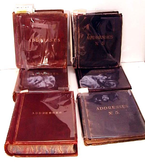 | Lot 143 London Saville Row Tailors Autograph Albums. London Saville Row Tailors Customer Address Record Books. 1895-1936. Six massive leather-bound volumes containing 12,500-15,000 autograph signatures and addresses. Address Book #1, red, 501 pp, March 1896-August 1912; Address Book #2, red, 540 pp, May 1912-September 1933; Address Book #3, red, 105 pp, September 1933-December 1936; Address Book #4, black, 266 pp, September 27, 1913-October 6, 1923; Address Book #5, black, 262 pp, September 10, 1923-May 1930; Address Book #6, black, 202 pp, June 30-December 1936. These albums contain signatures of members of European royalty including George VI of England (as Prince of Wales); signatures of many distinguished and historically significant people, including Albert Einstein, Edwin Hubbell, Felix Frankfurter, Bruce Cabot, Rudolph Valent ino, George H. Doran, Gene Tunney, James Forestall, Alfred Lunt, Paul Robeson, Maurine Baring, George Cunard, Charles Scribner, George White, Baron Rothschild and other various Rothschilds, John Foster Dulles, Captain of the Titanic Edward J. Smith, Bernard Berenson, Ernest Thesiger, Thomas O. M. Sopwith, David Lloyd George, J. Cominsky owner of the Chicago White Sox, David Niven, Cecil Beaton, Claude Rains, Raymond Massey, George Gershwin, Cole Porter, automobile manufacturer J. Bugatti, gambler Arnold Rothstein who fixed the 1919 Baseball World Series, department store owner Marshal Field, publisher Charles Scribner, Rudyard Kipling, W. Somerset Maughan, Siefgried Sassoon, Claude Rains, Fred Astaire, film director Billy Wilder, hotel owner Charles Tirz, boxer Max Baer, Joseph Pulitzer, Jr., Walter Chrysler, Jr., Noel Coward, Aga Khan, Aly Khan, Sacheverall Sitwell, Robert Donat, Kenneth Clark, David Niven, Niget Bruce, Nelson Doubleday, L.P. Hartley, book collector H. Bradley Martin, Otto Kahn, William Howard Taft, Algernon Blackwood, etc. Leather worn and used, corners bumped, stains and discoloration, foxing on page edges. |