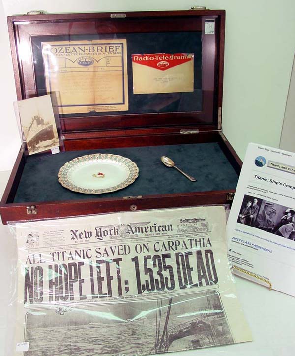 | 169 Titanic Memorabilia. A White Star Line ironstone dessert plate in the Wisteria pattern centering the White Star emblem, mark Stonier & Co. Ltd., Liverpool, and an Elkington silver plated dessert spoon with the White Star emblem, mounted in a hinged mahogany box with a Radio-Tele&Gramm: Ozean-Brief Ocean-Letter * Carta de Alto Mar debeg [DEBEG German, abbreviation for 'Deutsche Betriebsgesellschaft für drahtlose Telegraphie'] from Titanic Survivor Margaret Easton that reads: My Dear Colonel, I am sending, under separate cover, the wonderful keepsakes from the ship with the true belief that they will remain with you and your lovely family. I saved them from the fate of the deep that tragic night. This spoon and small plate were with me when we boarded the lifeboat and set adrift from Titanic. Yours, then signed in red pencil Margaret E., nd., losses, and a Radio-Tele&Gram envelope typed on verso: Note from Margaret Easton Survivor of the Titanic Disaster, losses, mounted under glass inside box lid. Dessert plate, D: 7 1/2", Dessert spoon, L: 5", Radio-Tele & Gramm: 7 1/2"x 8 1/4". |