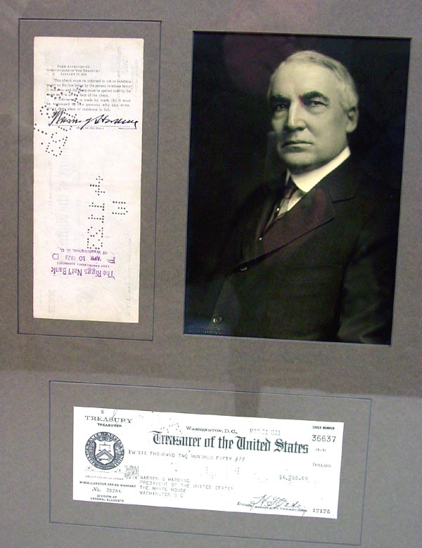 | Lot 298 Warren G. Harding Rare Printed Presidential Paycheck Signed (Endorsed) as President. Issued by the Treasurer of the United States, Washington, D.C, March 31, 1923. The green check - #36637 - is imprinted at the left with the seal of the U.S. Treasury, and is made out to Warren G. Harding President of the United States The White House Washington DC. It is also signed by the Deputy Assistant Treasurer of the United States, H.T. Tate. The salary check, dated at the end of the month of March 1923, is in the amount of $6,250.00. On verso, below Hardings endorsing signature, is the Riggs Natl Bank stamp, 3 1/4" x 8 1/2", Together With a black and white photo of Harding impressed with Harrison & Ewing Washington DC copyright stamp, (discoloration around stamp). Extremely rare. In fine condition. |