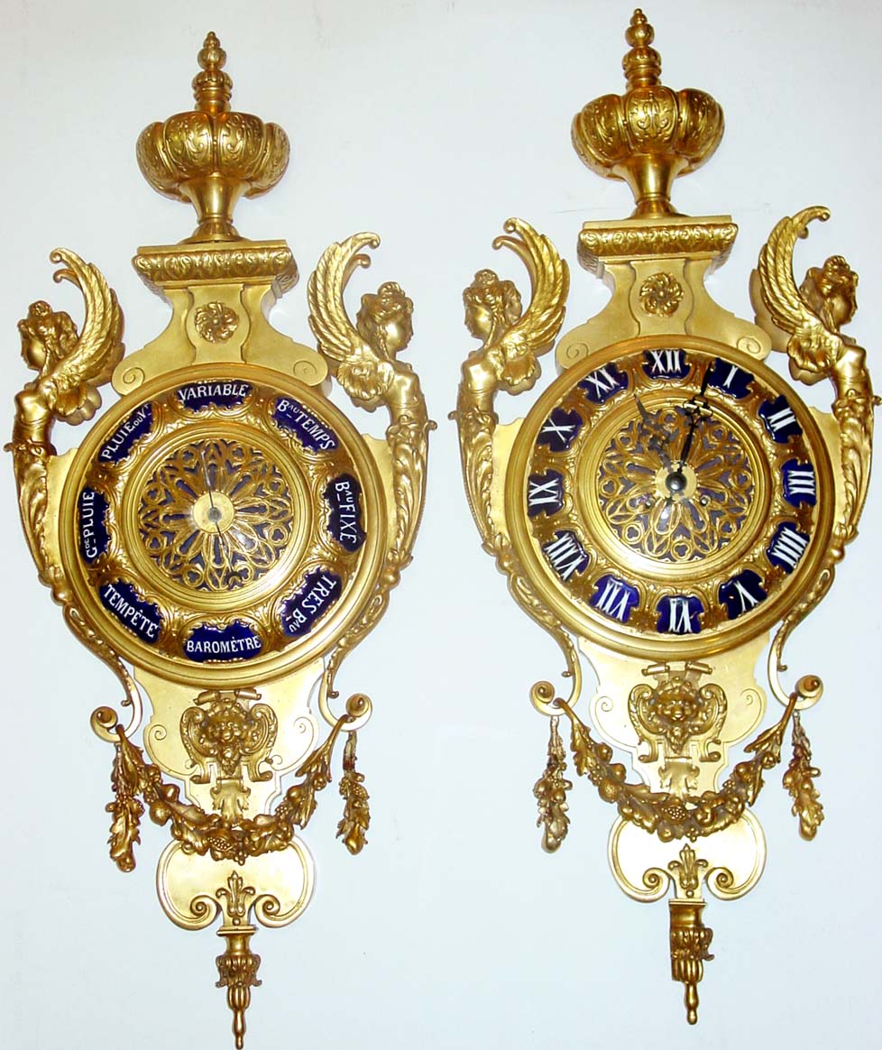 | Lot 1087A Louis XV Style Ormolu Cartel Clock and Matching Barometer. 19th century. Scrolled foliate cartouche centering pierced dial with cobalt and white enamel chapters, flanked by winged terms, above a mask and floral swags, H: 36", small repair to one chapter, one hand needs reattaching. |
