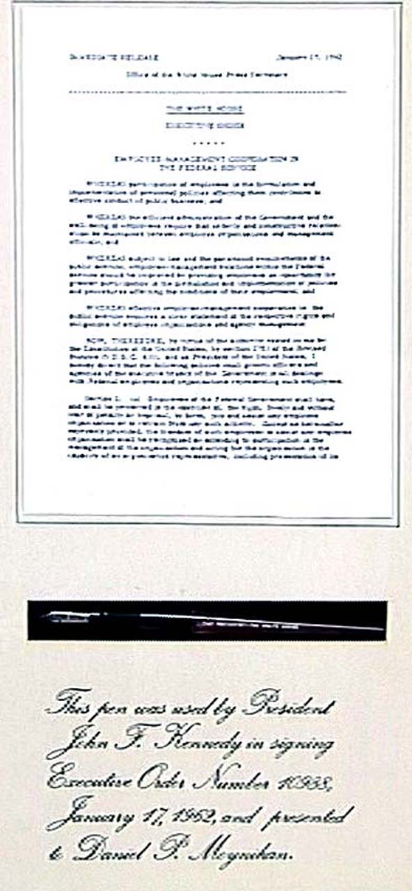 | Lot 1312 John Kennedy Signing Pen. Given to Patrick Moynihan; with card that reads: This pen was used by President John F. Kennedy in signing Executive Order Number 10988, January 17, 1962, and presented to Daniel P. Moynihan. 6" x 8 1/4" card, nib point ink pen with The PresidentThe White House on Lucite stem, 6" long. Overall 19 3/4" x 11 1/2", framed. |